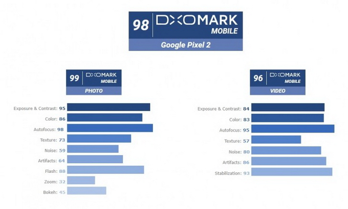 แน่นอนว่า กล้องถ่ายรูปถือว่าเป็นจุดขายที่โดดเด่นของ Google Pixel 2 และ Google Pixel 2 XL ซึ่งก็ได้รับคะแนนจาก DxOMark สูงถึง 98 คะแนนในส่วนของภาพนิ่ง และได้รับ 96 คะแนน จากการบันทึกวีดีโอ เท่ากับว่าได้รับการการันตีว่า "ยอดเยี่ยมในเรื่องกล้องสมบูรณ์แบบ"