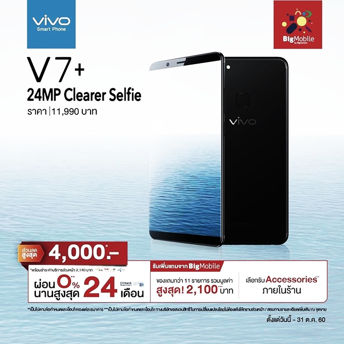 ล่าสุดที่มาพร้อมโปรโมชั่นดีๆ จากทาง Big Mobile Care ให้ลูกค้าที่สนใจ Vivo V7+ รับส่วนลดสูงสุด 4,000 บาท เมื่อสมัครแพ็คเกจ กับ AIS, TrueMoveH และ Dtac พร้อมชำระค่าบริการล่วงหน้า 2,410 บาท