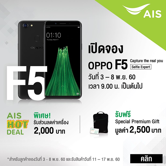 เอไอเอส เปิดจองสมาร์ทโฟน OPPO F5 รับฟรี Special Premium Gift มูลค่า 2,500 บาท พร้อมรับส่วนลดค่าเครื่อง 2,000 บาท เมื่อซื้อเครื่องพร้อมแพ็กเกจ 4G Hot Deal Non-Stop ตั้งแต่วันนี้ - 2 พ.ย. 60