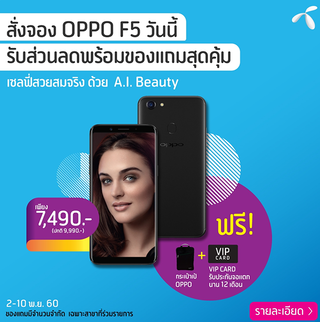 สั่งจองสมาร์ทโฟน OPPO F5 กับ ดีแทค วันนี้ เพียง 7,490บาท (ราคาปกติ 9,990 บาท) เมื่อสมัครแพ็คเกจตั้งแต่ 499 บาทขึ้นไป จ่ายค่าบริการล่วงหน้า 1,200 บาท (คืนส่วนลดนาน 12 เดือน) พร้อมรับฟรี กระเป๋าเป้ OPPO และ VIP Card เปลี่ยนหน้าจอแตกนาน 12 เดือน วันนี้ - 10 พ.ย. 2560