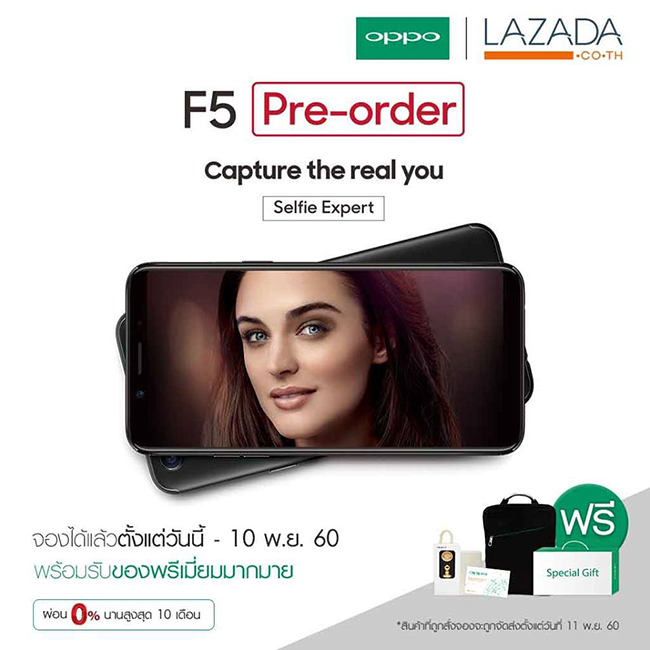จองสมาร์ทโฟน OPPO F5 กับ ลาซาด้า รับฟรี ระเป๋าเป้ OPPO, VIP Card เปลี่ยนหน้าจอแตกนาน 12 เดือน และ Special Gift พิเศษ! สำหรับลูกค้าออนไลน์ รับฟเพิ่ม ตุ๊กตาขนาด 14 นิ้ว และที่วางโทรศัพท์แบบแม่เหล็ก พร้อมแบตเตอรี่สำรอง 10,000 mAh