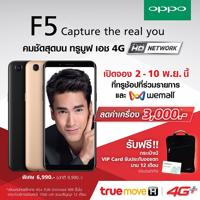 สั่งจอง OPPO F5 กับ ทรูมูฟ เอช รับส่วนลดค่าเครื่อง 3,000 บาท เมื่อสมัครแพ็กเกจ 4G+ FUN Unlimited 499 ขึ้นไป พร้อมชำระค่าบริการล่วงหน้า 1,500 บาท (ระยะสัญญา 12 เดือน) ฟรี! รับของสมนาคุณสุดพิเศษ วันนี้ - 10 พ.ย. 2560