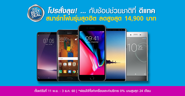โปรสั่งลุย! กับช้อปช่วยชาติ ... ดีแทค สนองนโยบายกระตุ้นเศรษฐกิจ จัดทัพสมาร์ทโฟนราคาสุดพิเศษ Best Deal แคมเปญ รวมลดราคาสูงสุด 14,900 บาท ให้ลูกค้าดีแทคลดหย่อนภาษีสูงสุดถึง 15,000 บาท ในโครงการ "ช้อปช่วยชาติ" ให้ผ่อนได้ทั้งค่าเครื่องและค่าบริการ 0% นานสูงสุด 24 เดือน พิเศษสุด! สำหรับลูกค้าย้ายค่ายเบอร์เดิมลดเพิ่มอีก 1,500 บาททุกรุ่น ตั้งแต่วันที่ 11 พ.ย. - 3 ธ.ค. 60 เท่านั้น!