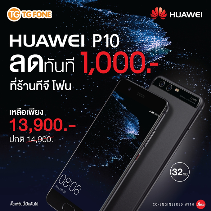 ซื้อ Huawei P10 วันนี้ รับส่วนลดทันที 1,000 บาท เฉพาะที่ TG FONE เท่านั้น