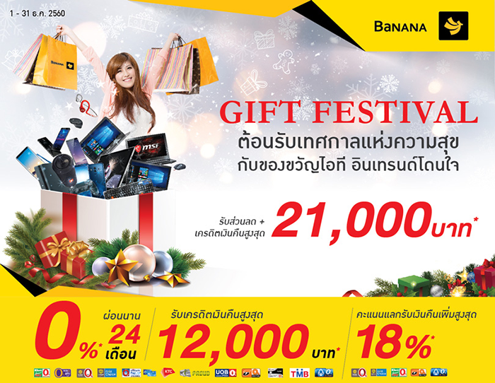 Gift Festival ต้อนรับเทศกาลแห่งความสุข กับของขวัญไอที พร้อมสมาร์ทโฟนสุดฮิต อินเทรนด์โดนใจ ที่ BaNANA และ BaNANA Mobile ทุกสาขา ตั้งแต่วันนี้ 1 - 31 ธันวาคม 2560