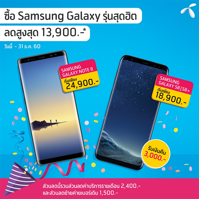 Samsung Galaxy S8+ (ราคาเครื่องเปล่า 30,900 บ.) ลดสูงสุด 12,900 บาท เมื่อสมัครแพ็กเกจเริ่มต้น 599 ขึ้นไป สามารถรับเงินคืนเพิ่มอีก 3,000 บาท ผ่าน Samsung Pay ผ่อนได้ทั้งค่าเครื่องและค่าบริการรายเดือนล่วงหน้า 0% นานสุงสุด 24 เดือน (ส่วนลดนี้รวมส่วนลดค่าบริการรายเดือน 2,400 บาท) ลูกค้าย้ายค่ายเบอร์เดิมรับส่วนลดเพิ่มอีก 1,500 บาท