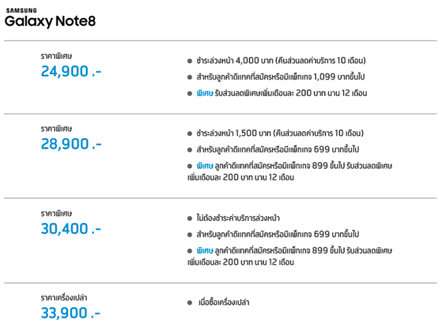 Samsung Galaxy Note8 (ราคาเครื่องเปล่า 33,900 บ.) ลดสูงสุด 11,400 บาท เมื่อสมัครแพ็กเกจเริ่มต้น 699 ขึ้นไป พิเศษ! ลูกค้าดีแทคที่สมัครหรือมีแพ็กเกจ 899 ขึ้นไป รับส่วนลดพิเศษเพิ่มเดือนละ 200 บาท นาน 12 เดือน และลูกค้าย้ายค่ายเบอร์เดิมรับส่วนลดเพิ่มอีก 1,500 บาท