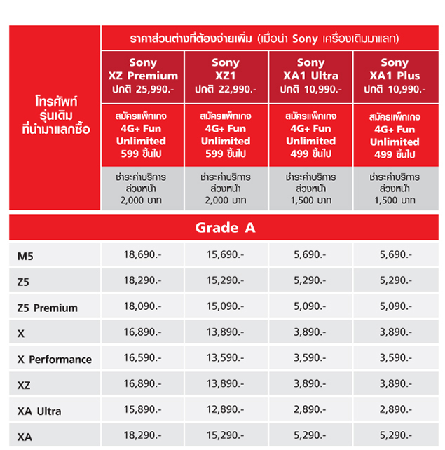 Sony ส่งความสุข ต้อนรับปีใหม่ ด้วยการให้คุณเปลี่ยนมือถือ Sony ที่ใช้อยู่มาแลกเครื่องใหม่ที่ใช่กว่า ในราคาลดสูงสุด 10,000 บาท ที่ทรูช้อป เมื่อซื้อสมาร์ทโฟน Sony เครื่องใหม่ที่ร่วมรายการ และสมัครแพ็กเกจและชำระค่าบริการล่วงหน้าตามที่กำหนด ระยะเวลาโปรโมชั่นวันนี้ - 31 มกราคม 2561เงื่อนไขการตรวจรับเครื่องเพื่ออัพเกรดเป็นรุ่นที่ถูกใจ