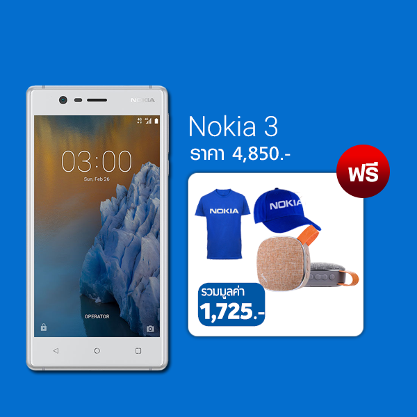 Nokia 3 รับฟรี เสื้อยืด หมวก ลำโพง รวมมูลค่า 1725.-