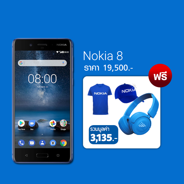 Nokia 8 รับฟรีเสื้อยืด หมวก หูฟังJBL รวมมูลค่า 3135.-