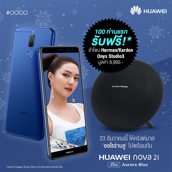 พิเศษสุด! สำหรับลูกค้าที่ซื้อ HUAWEI nova 2i Aurora Blue ณ HUAWEI Experience Shop สาขาสยามพารากอน ในวันที่ 23 ธันวาคมนี้ ตั้งแต่เวลา 10.00 น. เป็นต้นไป รับลำโพง harman/kardon รุ่น Onyx Studio 3 มูลค่า 8,990 บาท ฟรีทันที! ใครสนใจต้องรีบหน่อย เฉพาะลูกค้า 100 ท่านแรก เท่านั้น!