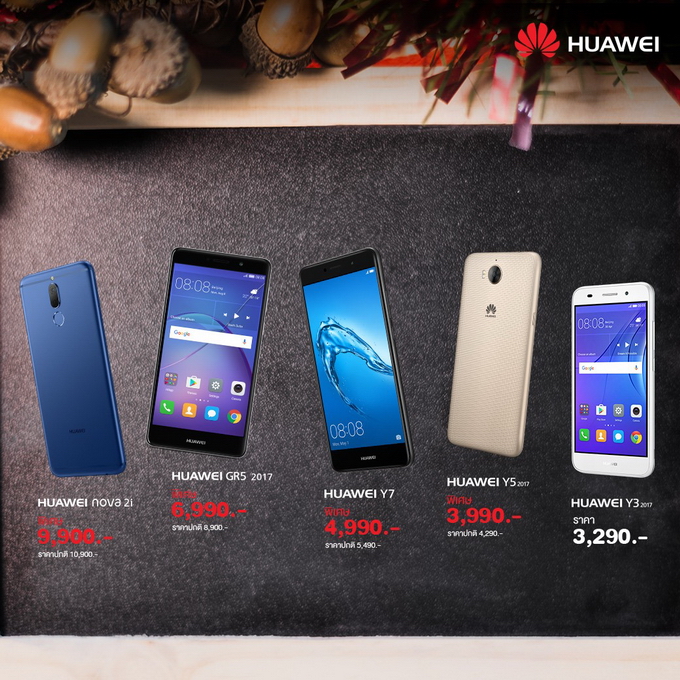 หัวเว่ย มอบความสุขส่งท้ายปี ด้วยการชวนคนไทยมอบของขวัญวันปีใหม่ให้ตัวเองและคนที่คุณรัก กับแคมเปญพิเศษสำหรับสมาร์ทโฟน 5 รุ่น และแทบเล็ตอีก 2 รุ่นยอดนิยม ได้แก่ HUAWEI P10 Series, HUAWEI Mate 9 Series, HUAWEI nova2i, HUAWEI GR5 2017 Series และ HUAWEI Y Series รวมถึงแทบเล็ต HUAWEI MediaPad M3 และ HUAWEI MediaPad T Series ให้ทุกคนเป็นเจ้าของได้ง่ายขึ้นต้อนรับปีใหม่นี้