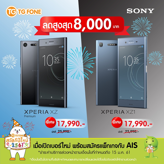 SONY จับมือ TG fone จัดโปรโมชั่นลดราคาพิเศษกับสมาร์ทโฟน Sony Xperia XZ Premium และ Sony Xperia XZ1 รับส่วนลดสูงสุด 8,000 บาท เพียงซื้อเครื่องพร้อมเปิดเบอร์ใหม่กับ AIS พร้อมโปรโมชั่นผ่อน 0%- Sony Xperia XZ Premium จากราคาปกติ 25,990 บาท เหลือเพียง 17,990 บาท