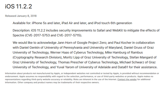 สำหรับการอัพเดทนี้ คาดว่าจะออกมาเพื่อแก้ปัญหาและอุดช่องโหว่ของ Spectre และ Meltdown ซึ่งทาง Apple ก็ได้ปล่อยอัพเดท iOS 11.2 ไปก่อนหน้านี้แล้ว แต่ในอัพเดทล่าสุด iOS 11.2.2 จะเป็นการแก้ไขในส่วนของ Safari และ WebKit