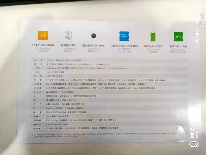Meizu M6s สมาร์ทโฟนรุ่นใหม่ที่คิวจะเปิดตัววันที่ 17 ม.ค. 61 ล่าสุดมีภาพแผ่นพับหลุดออกมาเผยให้เห็นว่าตัวเครื่องมาพร้อมกับดีไซน์สมัยนิยมแบบไร้ขอบ บนหน้าจออัตราส่วน 18:9 รวมๆ ผมว่าดูสวยงามใช้ได้เลยครับ แถมในแผ่นพับยังระบุด้วยว่ารุ่นนี้จะใช้ชิปเซ็ต Exynos 7872 มาตรฐานการผลิตระดับ 14 นาโนเมตร ของ ซัมซุง