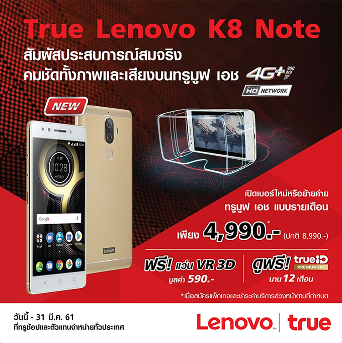 Lenovo K8 Note ในราคาสุดคุ้มเพียง 4,990 บาท (จากปกติ 8,990 บาท) เมื่อจ่ายค่าบริการล่วงหน้า 1,500 บาท พร้อมสมัครแพ็คเกจ 4G+ Fun Unlimited 499 บาทขึ้นไป สัญญา 12 เดือน เท่านั้นไม่พอ รับฟรี แว่น VR 3D มูลค่า 590 บาท และดูฟรี True ID Premium HD นาน 12 เดือน