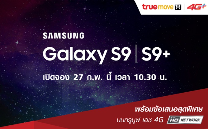 www.truemoveh.com/galaxys9/pre-order ทั้งนี้ ลูกค้าสามารถรับเครื่องได้ตั้งแต่วันที่ 9 - 11 มี.ค. 2561สำหรับรุ่นความจุ 64GB และสำหรับรุ่นความจุ 256GB รับเครื่องได้ตั้งแต่วันที่ 29 - 31 มี.ค. 2561 ที่ทรูช้อปทุกสาขา