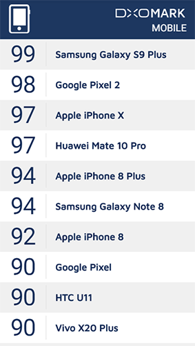 ทาง DxO Mark ให้เหตุผลว่า Samsung Galaxy S9+ ได้คะแนนรวม 99% เป็นอันดับ 1 ในฝั่งของโทรศัพท์มือถือ มีคะแนนสูงกว่า Google Pixel 2 XL เพียงแค่เปอร์เซ็นเดียวเท่านั้น และมากกว่า iPhone X สองเปอร์เซ็น สำหรับกล้องของ Samsung Galaxy S9+ นั้นไม่มีจุดอ่อนอย่างชัดเจน ทำผลงานได้ดีทุกการทดสอบ รวมไปถึงการบันทึกวีดีโออีกด้วย