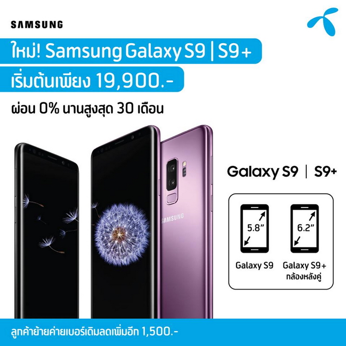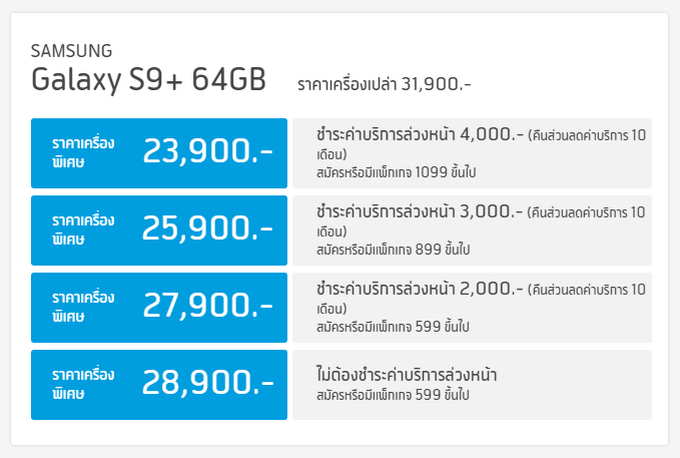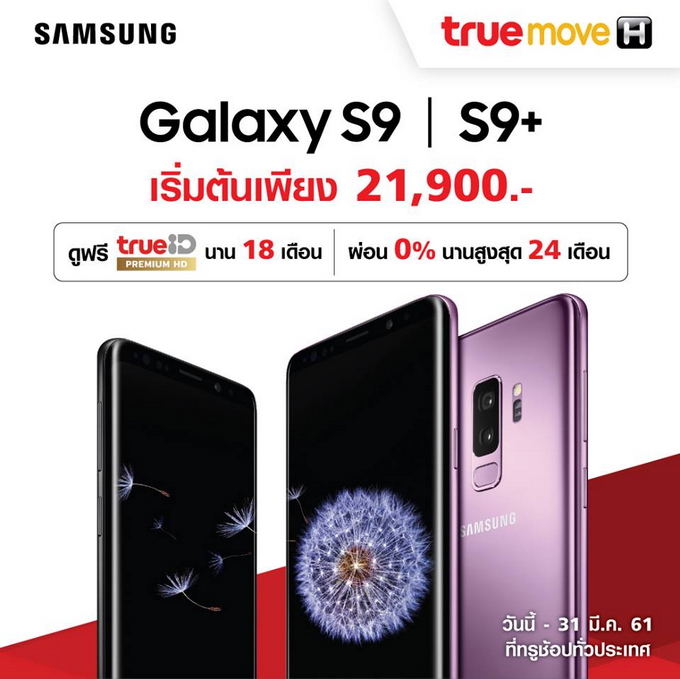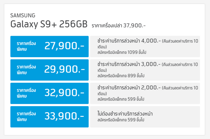 - Samsung Galaxy S9+ 256GB ราคา 37,900 บาท (เฉพาะช่องทางของพาร์ทเนอร์ผู้ให้บริการเครือข่าย)