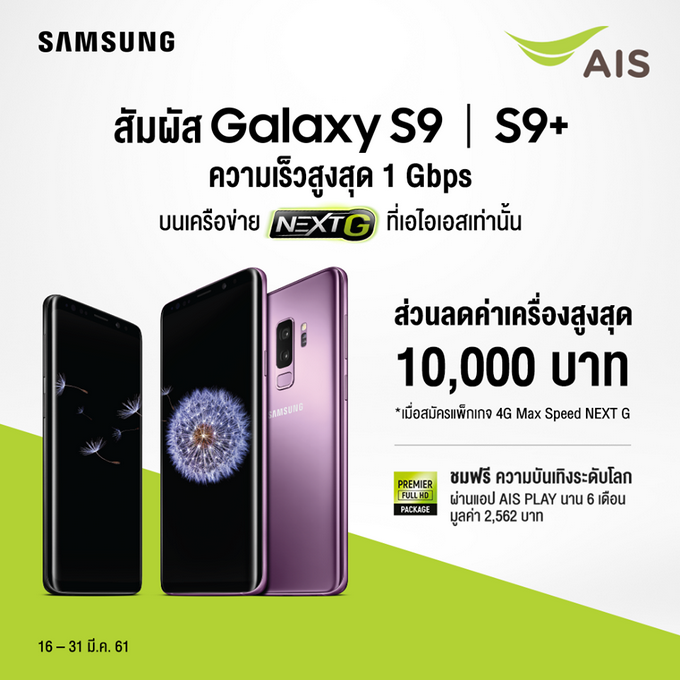 เมื่อซื้อ Samsung Galaxy S9 และ Samsung Galaxy S9+ กับทาง เอไอเอส พร้อมแพ็กเกจ 4G Hot Deal Non-Stop หรือ 4G Max Speed NEXT G รับส่วนลดค่าเครื่องสูงสุด 10,000 บาท พร้อมรับชมฟรี AIS Play แพ็กเกจเสริม Premier Full HD นาน 6 เดือน มูลค่า 2,562 บาท และลูกค้าย้ายค่ายเบอร์เดิม รับส่วนลดเพิ่ม 1,000 บาท พิเศษผ่อน 0% นาน 24 เดือน กับบัตรเครดิตที่ร่วมรายการ พร้อมรับสิทธิ AIS Serenade