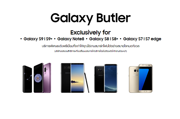 นอกจากนี้ Samsung Galaxy S9 และ Samsung Galaxy S9+ ยังอยู่ในเงื่อนไขของบริการ Galaxy Butler เสมือนผู้ช่วยส่วนตัว สุดเอคคลูซีฟ ให้คุณอุ่นใจตลอด 24 ชม. แนะนำการใช้งานตัวเครื่อง การตั้งค่า และการใช้งาน Application ต่างๆ รวมถึงแก้ไขอาการเสียเบื้องต้น และบริหารจัดการ ติดตามเครื่องซ่อม หรือเปลี่ยนเครื่อง จองคิวล่วงหน้า ก่อนเข้ารับบริการที่ศูนย์บริการ ที่ Call center 02-689-3233 และบริการพิเศษอื่นๆอีกมากมายเฉพาะสมาร์ทโฟนเรือธงของ ซัมซุง เท่านั้น