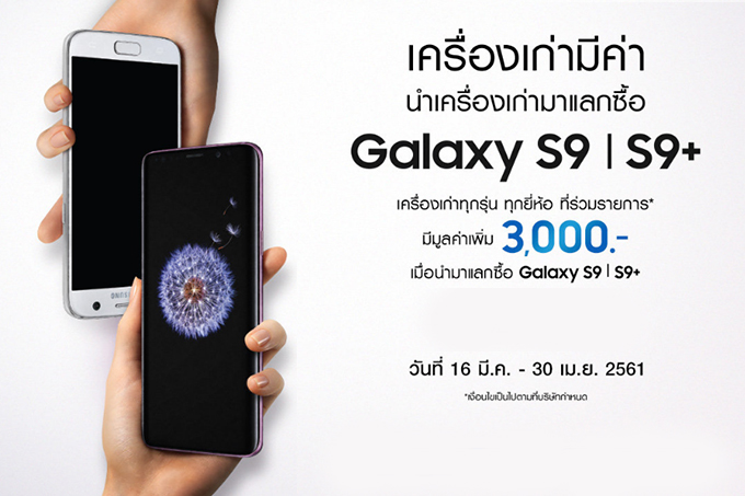ซัมซุง ยังขยายเวลาโปรโมชั่นนำเครื่องเก่ามาแลกเครื่องใหม่ โดยนำสมาร์ทโฟนซัมซุงเครื่องเก่าเฉพาะซีรีส์ เอส หรือ โน้ต รุ่นที่ร่วมรายการ (ไม่รวม Tablet) มาแลกเป็นส่วนลดพิเศษมูลค่า 3,000 บาท เพิ่มเติมจากราคาประเมินเพื่อแลกซื้อ Samsung Galaxy S9 และ Samsung Galaxy S9+ (เงื่อนไขตามโปรโมชั่นเก่าแลกใหม่)