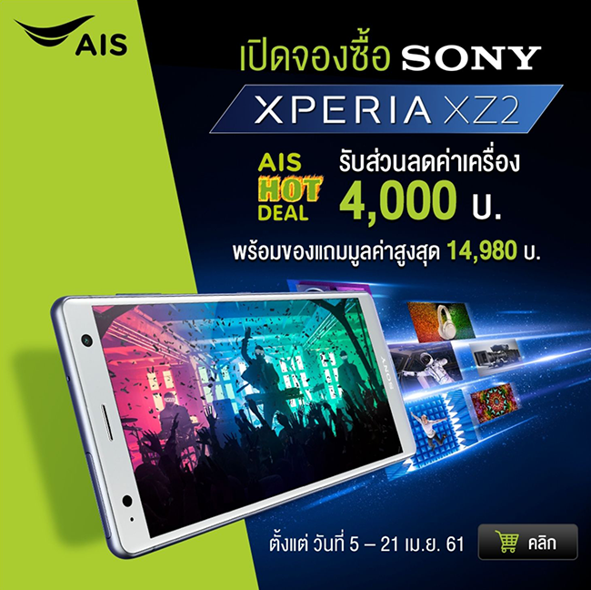 จอง Sony Xperia XZ2 กับ เอไอเอส รับส่วนลดค่าเครื่องสูงสุด 4,000 บาท พร้อมรับฟรี Play Station 4 Slim 1TB มูลค่า 14,980.- พร้อม Wireless Joy (จำนวนจำกัด 100 ท่าน) เมื่อชำระค่าบริการล่วงหน้า 6,000 บาท พร้อมสมัครแพ็กเกจเริ่มต้น 1,099 บาท
