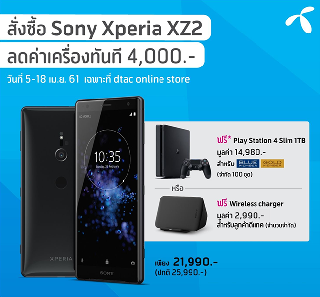 สั่งซื้อ Sony Xperia XZ2 กับ ดีแทค ผ่านทาง dtac online store ตั้งแต่วันนี้ - 18 เมษายน 2561 รับส่วนลดค่าเครื่องสูงสุด 4,000 บาท เหลือเพียง 21,990.- (จากปกติ 25,990.-) และรับฟรี Wireless Charger มูลค่า 2,990.- (จำนวนจำกัด) สิทธิพิเศษสำหรับ Blue Member และ Gold Member รับฟรี Play Station 4 Slim 1TB มูลค่า 14,980.- พร้อม Wireless Joy (จำนวนจำกัด 100 ท่าน) เมื่อชำระค่าบริการล่วงหน้า 3,000 บาท (คืนส่วนลดค่าบริการนาน 10 เดือน) พร้อมสมัครหรือมีแพ็กเกจ 1,099 บาทขึ้นไป