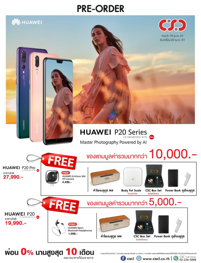 โปรโมชั่นสุดเร้าใจจาก CSC จองสมาร์ทโฟน Huawei P20 และ Huawei P20 Pro จาก หัวเหว่ย เพียง 1,000 บาท รับทันที ของแถมมูลค่านับหมื่นบาท! ตั้งแต่วันนี้ - 16 เม.ย. 2561 รับเครื่องได้วันที่ 20 เม.ย. 2561