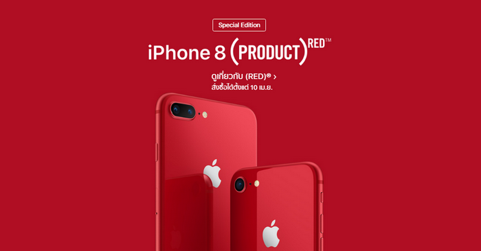 สำหรับ iPhone 8 และ iPhone 8 Plus (Product) RED เป็นโปรเจ็คที่ทาง Apple ทำขึ้นมาเพื่อช่วยสนับสนุน โครงการเกี่ยวกับ HIV/AIDS ซึ่งคอยให้คำปรึกษา ตรวจหาเชื้อ และจ่ายยา ที่ช่วยป้องกันการแพร่เชื้อ HIV จากแม่สู่ทารกในครรภ์ โดยสามารถระดมเงินได้กว่า 160 ล้านดอลลาร์สหรัฐ จากการจำหน่าย ผลิตภัณฑ์ (RED) ซึ่งทุกๆ การซื้อจะพาเราเข้าใกล้ยุคใหม่ที่ปราศจากโรคเอดส์มากขึ้นทีละนิดๆ งานนี้นอกจากจะได้สมาร์ทโฟนสีสันสวยงาม ยังได้เป็นส่วนหนึ่งในการช่วยมนุษยชาติด้วยนะครับ