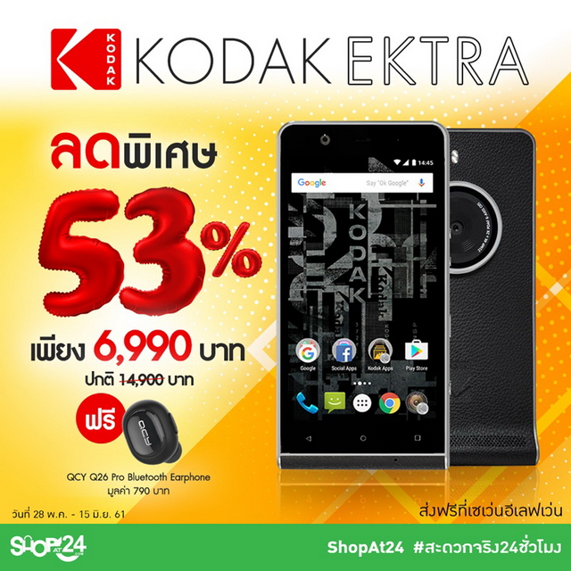 KODAK EKTRA ได้ลดราคาลงมาแล้วครับ เหลือเพียงแค่ 6,990 บาทเท่านั้น (จากราคาเดิม 14,900 บาท) พร้อมของแถมพิเศษ QCY Q26 Pro Bluetooth Earphone มูลค่า 790 บาท โดย ShopAt24 ใครที่สนใจสามารถไปซื้อกันได้เลยตามลิงก์นี้ครับ
