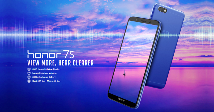 Honor 7S มาพร้อมดีไซน์ที่ดูสวย ขนาดตัวเครื่อง 146.5 x 70.9 x 8.3 มม. น้ำหนัก 142 กรัม, หน้าจออัตราส่วน 18:9 ขนาด 5.45 นิ้ว ความละเอียด HD+, ทำงานบน Android 8.1 Oreo, ชิปเซ็ต MediaTek MT6739, RAM 2GB, ROM 16GB รองรับ MicroSD, กล้องความละเอียด 13MP, กล้องหน้าความละเอียด 5MP, แบตเตอรี่ความจุ 3,020 mAh และมาพร้อมจุดขายลำโพงตัวเครื่องเสียงดังเป็นพิเศษ เพื่อให้เราได้ยินเสียงชัดเจนแม้ในสถานที่ที่มีเสียงรบกวนมากๆ