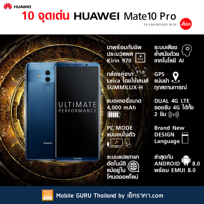 Huawei Mate 10 Pro สมาร์ทโฟนระดับเรือธงของ หัวเว่ย ที่ประมวลผลด้วยเทคโนโลยี AI รุ่นแรกของโลก และมาพร้อมกล้องคู่เทคโนโลยีจาก Leica มีให้เลือก 3 สี คือ Midnight Blue, Mocha Brown และ Titanium Grey ล่าสุดปรับลดราคาเหลือเพียง 21,990 บาทเท่านั้น ตั้งแต่วันนี้ - 31 กรกฎาคม 2561 ณ หัวเว่ยแบรนด์ช้อป และร้านตัวแทนจำหน่ายที่ร่วมรายการทั่วประเทศ