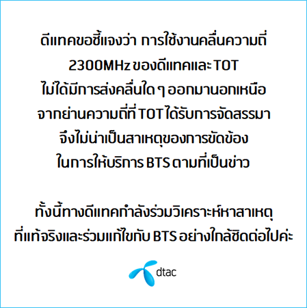 นายประเทศ ตันกุรานันท์ รองประธานเจ้าหน้าที่บริหารกลุ่มเทคโนโลยี บริษัท โทเทิ่ล แอ็คเซ็ส คอมมูนิเคชั่น จำกัด (มหาชน) หรือดีแทค ขอชี้แจงตามที่มีข่าวระบุระบบอาณัติสัญญาณรถไฟฟ้าบีทีเอสขัดข้องมีสาเหตุจากคลื่น 2300 MHz ว่า "dtac ขอชี้แจงว่า การใช้งานบนคลื่นความถี่ 2300 MHz ของดีแทคและทีโอทีไม่ได้ส่งคลื่นใดๆ ออกมานอกเหนือจากแบนด์ที่ทีโอทีได้รับการจัดสรรมา ซึ่งไม่น่าเป็นสาเหตุของการขัดข้องในการให้บริการรถไฟฟ้าบีทีเอสตามที่เป็นข่าว ทั้งนี้ ทางดีแทคกำลังร่วมวิเคราะห์หาสาเหตุที่แท้จริงและร่วมแก้ไขกับบีทีเอสอย่างใกล้ชิดต่อไป"