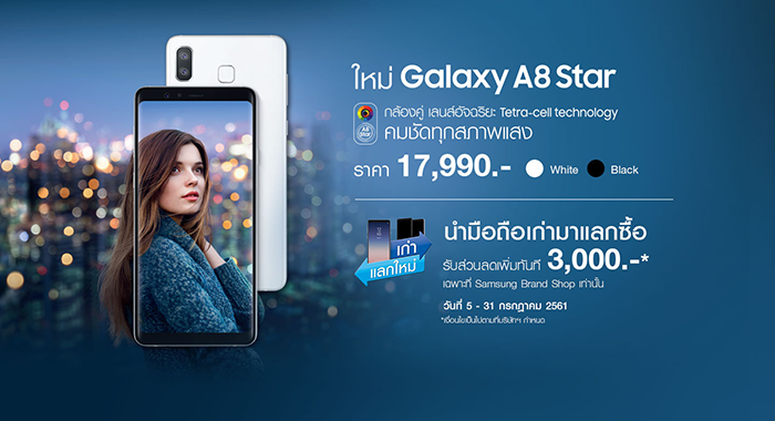 Samsung Galaxy A8 Star ตั้งแต่วันนี้ - 31 ก.ค. 61 รับส่วนลดเพิ่มทันที 3,000 บาท เฉพาะที่ Samsung Brand Shop เท่านั้น