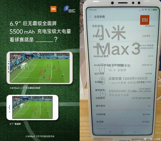 ล่าสุดมีภาพหลุดของ Xiaomi Mi Max 3 ออกมาทั้งกล่องเลยครับ มาพร้อมหน้าจอไร้ขอบซึ่งดูดีมากๆ ขอบบางและไม่มีติ่งบนหน้าจอ แถมหน้าจอขนาดใหญ่ถึง 6.9 นิ้วบนอัตราส่วน 18:9 ความละเอียด Full HD+, Snapdragon 636, กล้องคู่ความละเอียด 12MP + 5MP, RAM 4GB, ROM 64GB, ทำงานบน Android Oreo 8.1 ครอบทับด้วย MIUI 9.6 และแบตเตอรี่ความจุสูงมากครับ 5,500 mAh สมกับหน้าจอขนาดใหญ่ เป็นสมาร์ทโฟนที่เน้นการใช้งานเต็มตา และใช้งานต่อเนื่องได้ยาวนานจริงๆ