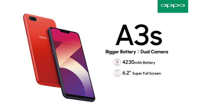 OPPO A3s มาพร้อมดีไซน์หรูหราเหมือนรุ่นใหญ่ หน้าจอ IPS ขนาด 6.2 นิ้ว อัตราส่วน 19:9 มีติ่งบนหน้าจอ หน้าจอมีพื้นที่คิดเป็น 81.2% ของพื้นที่หน้าจอทั้งหมด ความละเอียด HD+ 720 x 1520 pixels, ทำงานบน Android 8.1 Oreo ครอบทับด้วย Color OS 5.1, ชิปเซ็ต Qualcomm Snapdragon 450, Octa-core 1.8 GHz Cortex-A53, GPU Adreno 506, RAM 2GB, ROM 16GB รองรับ MicroSD, รุ่นนี้ไม่มีสแกนลายนิ้วมือนะครับ, รองรับ Wi-Fi 802.11 b/g/n/ac, Bluetooth 4.2, microUSB 2.0, เซ็นเซอร์ Accelerometer, proximity, compass, กล้องคู่ความละเอียด 13MP F2.2 + 2MP F2.4, กล้องหน้าความละเอียด 8MP F2.2, บันทึกวีดีโอความละเอียด Full HD 30FPS, แบตเตอรี่ความจุสูง 4,230 mAh