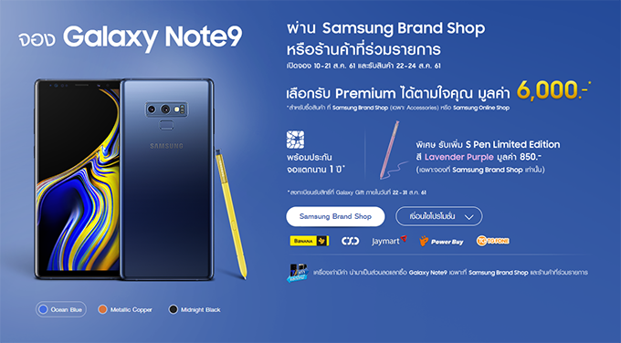 สั่งจอง Samsung Galaxy Note9 กับ Samsung Brand Shop และร้านค้าที่ร่วมรายการ ตั้งแต่วันนี้ - 21 ส.ค. 61 เลือกรับของกำนัล Premium ได้ตามใจคุณ มูลค่า 6,000 บาท พร้อมรับฟรี ปากกา S Pen Limited Edition สี Lavender Purple มูลค่า 850 บาท (เฉพาะจองที่ Samsung Brand Shop เท่านั้น) นอกจากนี้ยังได้สิทธิรับประกันหน้าจอแตกนาน 1 ปี นอกจากนี้ ยังสามารถนำเครื่องเก่ามาเป็นส่วนลดการเเลกซื้อได้อีกด้วย (เฉพาะ Samsung Brand Shop และร้านค้าที่ร่วมรายการ)
