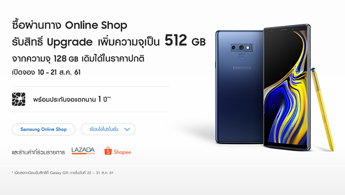 สิทธิพิเศษเฉพาะ LAZADA และ SHOPEE สั่งจอง Samsung Galaxy Note9 พร้อมรับสิทธิ์เพิ่มความจุจาก 128GB เป็น 512 GB ได้ในราคาปกติ พร้อมรับสิทธิประกันหน้าจอแตกนาน 1 ปีอีกด้วย รายละเอียดดังนี้