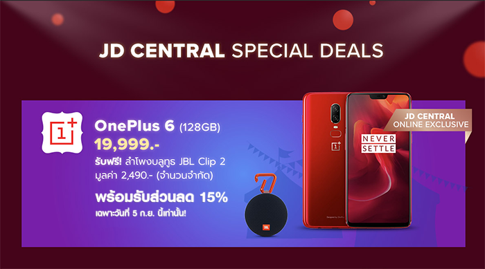 - สำหรับส่วนลดในวัน "OnePlus Day" ทุกๆ ท่านที่ช้อปปิ้งผ่านทาง JD Central ทุกออเดอร์ ลดเพิ่มไปอีก 15%