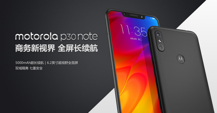 Motorola One Power หรือ Motorola P30 Note มาพร้อมหน้าจอ IPS ขนาด 6.2 นิ้ว ความละเอียด Full HD+ อัตราส่วน 19:9, Snapdragon 636, RAM 4GB, ROM 64GB รองรับ MicroSD, กล้องคู่ความละเอียด 16MP + 5MP, กล้องหน้าความละเอียด 12MP, แบตเตอรี่ความจุ 5,000 mAh รองรับชาร์จเร็ว, เป็นสมาร์ทโฟน Android One โดยในรุ่น Motorola P30 Note จะเป็นรุ่นเดียวกับ Motorola One Power แต่มีความแตกต่างตรงที่ใช้ ZUI 4.0 ซึ่งนำมาจากสมาร์ทโฟน ZUK ที่เลิกผลิตไปแล้ว ด้วยเงื่อนไขปัญหาระหว่าง Google และรัฐบาลจีน