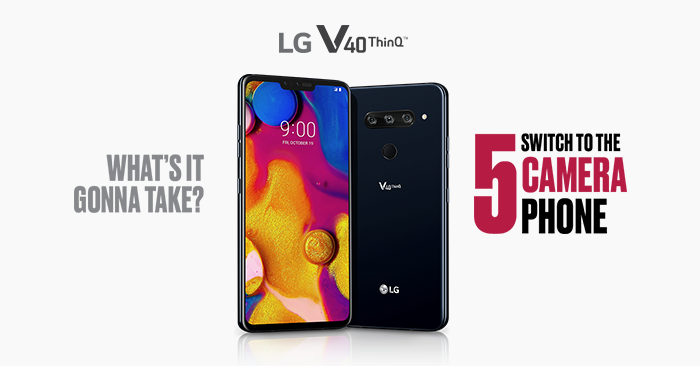 LG V40 ThinQอย่างเป็นทางการ ชูจุดเด่นกล้องแบบจัดเต็มถึง 5 ตัว (กล้องหน้า 2 ตัว และกล้องหลัง 3 ตัว) จอ OLED ขนาด 6.4 นิ้ว FullVision หน่วยประมวลผล Qualcomm Snapdragon 845 พร้อมหน่วยความจำ RAM 6GB และ ROM 64GB หรือ 128GB