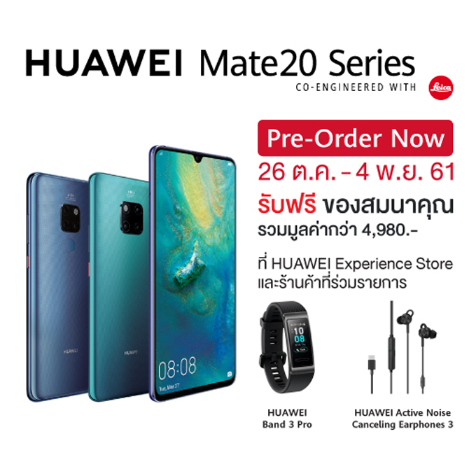 HUAWEI Mate 20 วางจำหน่ายในราคา 24,990 บาท - รับส่วนลดสูงสุด 15,000 บาท เมื่อซื้อพร้อมสมัครแพคเกจกับผู้ให้บริการเครือข่าย - ฟรี! HUAWEI Band 3 Pro และ HUAWEI Active Noise Canceling Earphones 3 (สำหรับร้านค้าที่ร่วมรายการ) - มีให้เลือก 2 สี ได้แก่ Twilight และ Midnight Blue