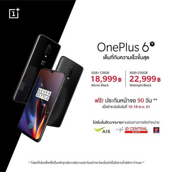 OnePlus 6T ในประเทศไทยวางจำหน่าย ความจุ 128GB ราคา 18,999 บาท ความจุ 256GB ราคา 22,999 บาท พิเศษประกันหน้าจอ 90 วันเมื่อชำระเงินตั้งแต่วันที่ 16-18 พ.ย. 61 วางจำหน่ายผ่าน AIS, Power Buy และ JD.co.th