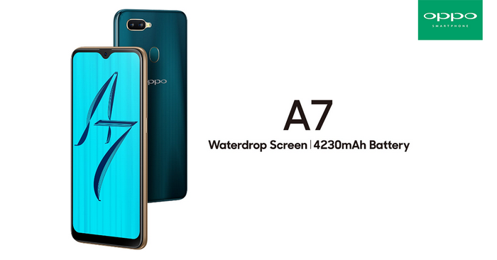 OPPO A7 มาพร้อมโทนสีและลวดลายแบบใหม่ดูแปลกตา ดีไซน์สวยงามพร้อมรอยบากบนหน้าจอรูปทรงหยดน้ำ หรือ Waterdrop ที่ได้รับแรงบันดาลใจในการดีไซต์รอยบากจากหยดน้ำที่กำลังหยดตามธรรมชาติ ซึ่งเป็นรอยบากหน้าจอที่สวยงาม รวมทั้งมีขนาดเล็ก หน้าจอ IPS ขนาด 6.2 นิ้ว อัตราส่วน 19:9 ความละเอียด HD+, กระจกหน้าจอ Gorilla Glass โค้ง 2.5D, Qualcomm Snapdragon 450, GPU Adreno 506, RAM 4GB, ROM 64GB รองรับ MicroSD, ทำงานบน Android 8.1 Oreo ครอบทับด้วย ColorOS 5.2, เซนเซอร์ Fingerprint, Light sensor, Proximity sensor, Accelerometer, Compass, กล้องคู่ความละเอียด 13MP + 2MP, กล้องหน้าความละเอียด 16MP, แบตเตอรี่ความจุ 4,230 mAh