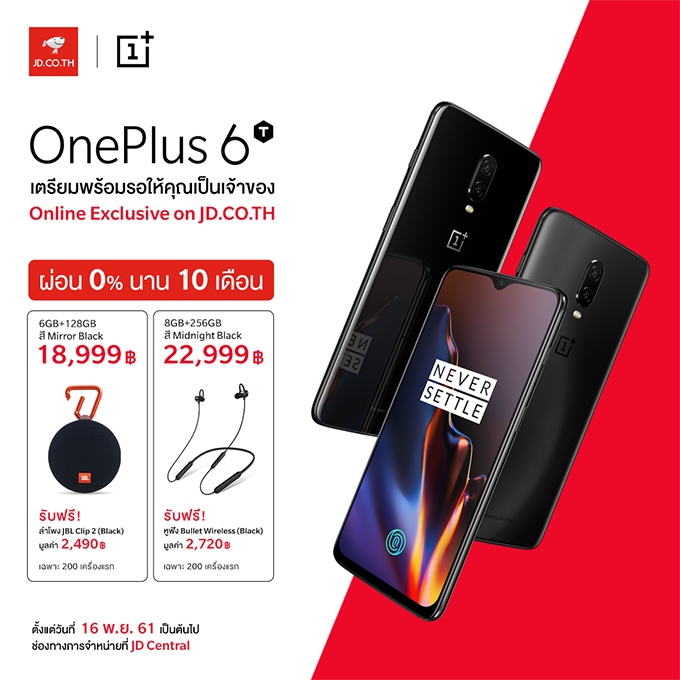 พร้อมกันนี้ทาง JD Central ก็ได้จัดโปรโมชั่นของแถมจัดเต็ม เมื่อสั่งซื้อ OnePlus 6T ในความจุ 6GB + 128GB ในสี Mirror Black รับฟรี! ลำโพง JBL Clip 2 สีดำ มูลค่า 2,490 บาท สำหรับ 200 เครื่องแรก และเมื่อสั่งซื้อความจุ 8GB + 256GB ในสี Midnight Black รับฟรี! หูฟัง Bullet Wireless สีดำ สำหรับ 200 เครื่องแรกเช่นกัน และยังมีโปรโมชั่นผ่อน 0% นาน 10 เดือน