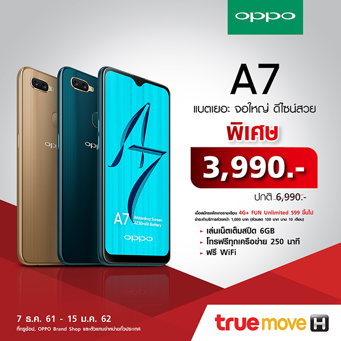 OPPO A7 ที่จัดเต็มความจุแบตเตอรี่ถึง 4,230 mAh ใช้งานได้ทั้งวัน กับหน่วยความจำ RAM 4GB และ ROM 64GB ดีไซน์สุดพรีเมี่ยม ในราคาเพียง 3,990 บาท (จากราคาปกติ 6,990 บาท) บนทรูมูฟ เอช เครือข่าย 4G+ อันดับหนึ่ง แรงชัด ครอบคลุมทั่วไทย เมื่อซื้อพร้อมแพ็คเกจโปรรายเดือน 4G+ FUN Unlimited 599 บาทขึ้นไป และชำระค่าบริการล่วงหน้า 1,000 บาท พร้อมรับส่วนลด 100 บาท นาน 10 เดือน เล่นเน็ตแรง 4G + 3G ความเร็วเต็มสปีด 6GB โทรฟรีทุกเครือข่าย 250 นาที เล่น WiFi ฟรีไม่จำกัดจาก