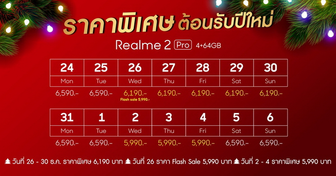- วันที่ 24 ธ.ค. 2561 - 6 ม.ค. 2562 จะวางจำหน่ายในราคา 6,590 บาท ทุกช่วงเวลา