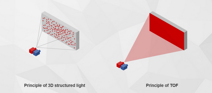 TOF 3D Camera TOF หรือ Time of Flight คือ เทคโนโลยีที่ใช้วัดระยะระหว่างเซ็นเซอร์กับวัตถุ โดยลักษณะการทำงานไม่ใช่กระจายจุดแสงไปยังวัตถุ แต่เป็นการฉายแสงที่มีความสม่ำเสมอไปยังวัตถุ โดยแสงจะไม่ลดความหนาแน่นลงอย่างรวดเร็ว เทคโนโลยี TOF นี้เองสามารถประมวลผลจากรูปทรง ระยะความลึก ความห่าง และนำข้อมูลทั้งหมดมาสร้างรูปแบบ 3 มิติ และแสดงผลในรูปแบบ AR, โฮโลกราฟิคและอื่นๆ