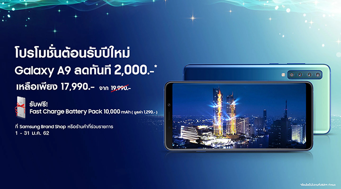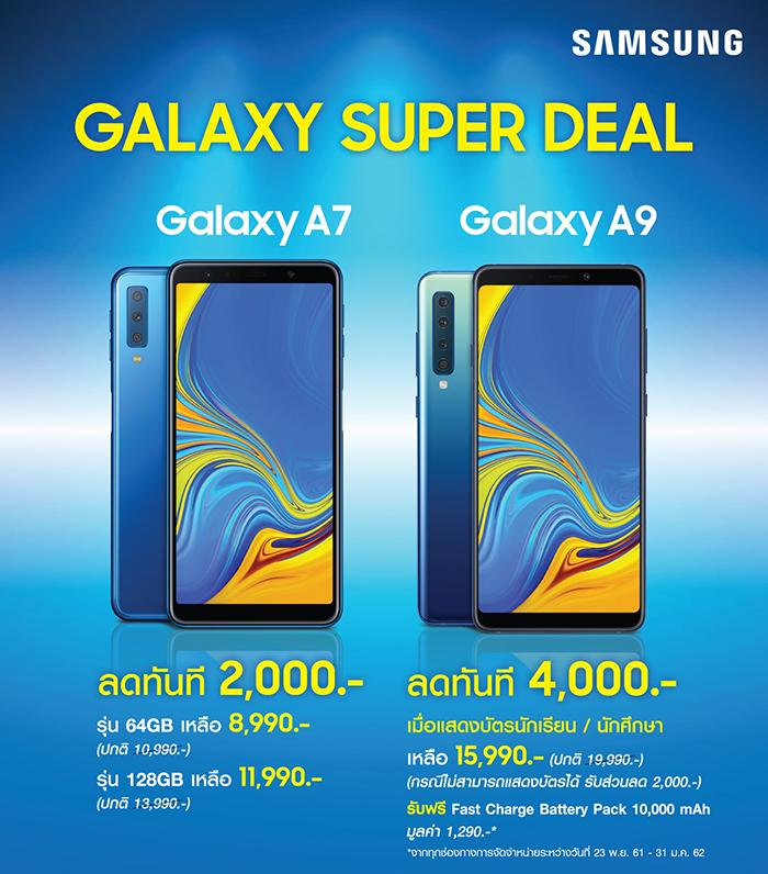 พิเศษสำหรับ Samsung Galaxy A9 สมาร์ทโฟนกล้องหลัง 4 ตัวเครื่องแรกของโลก รับส่วนลด 4,000 บาท เมื่อแสดงบัตรนักเรียนหรือบัตรนักศึกษา จากราคาปกติ 19,990 บาท เหลือเพียง 15,990 บาท หรือรับส่วนลดทันที 2,000 บาท กรณีไม่สามารถแสดงบัตรได้ พร้อมรับฟรี Fast Charge Battery Pack 10,000 mAh มูลค่า 1,290 บาท (จำนวนจำกัดเพียง 20,000 ชิ้นเท่านั้น)